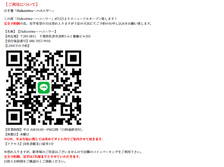 営業時間【完全予約制】前日までに問い合わせメール、または電話で